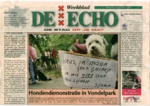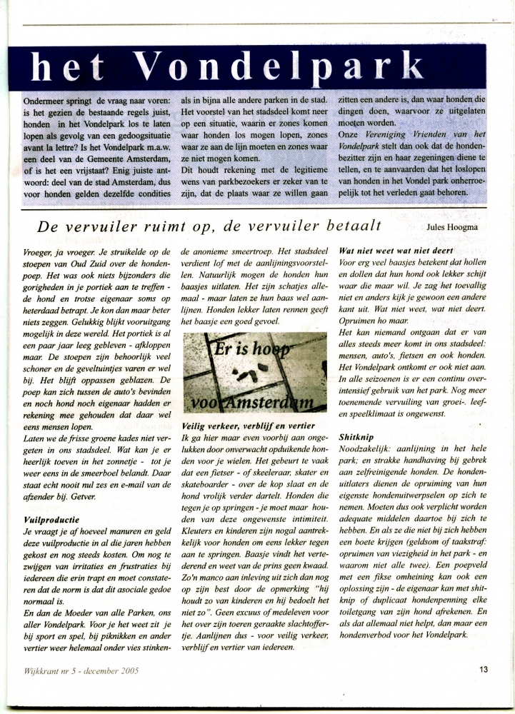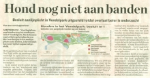 Diverse artikelen uit de regionale kranten Regels Vondelpark Honden nog niet aan banden Honden in het Vondelpark 1 Honden in het Vondelpark 2 Hondendemonstratie in Vondelpark Informatieavond hondenoverlast Wat vind u van hondenoverlast Notitie Hondenoverlast Vondelpark Besluitenlijst Raadsvergadering Bijtincident Vondelpark Regels lastige hond en baas 1 Regels lastige hond en baas 2